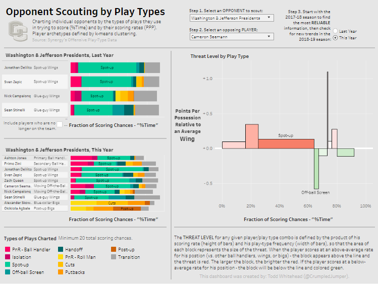 I used the same approach to group Division 3 NCAA players by offensive role. I created an opponent scouting dashboard to help predict how each opposing player would try to score and in which types of plays he would pose the greatest threat.