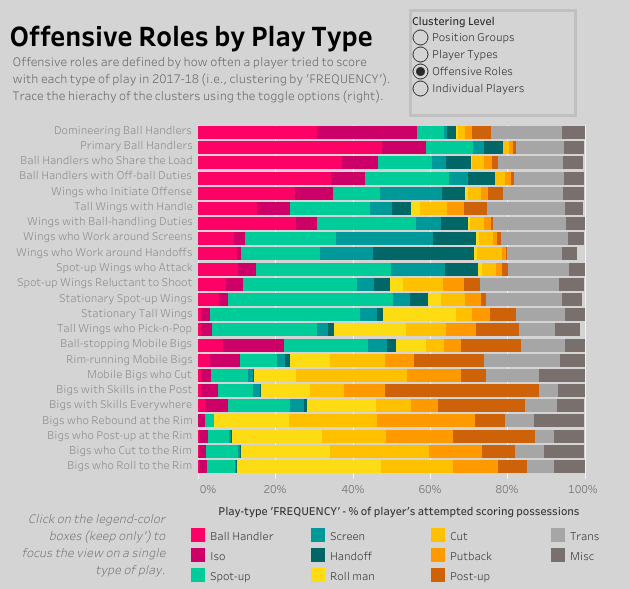 I’ve used several clustering approaches to group players by offensive role using Synergy’s play-type data. My approach has been to sort players by the types of plays which they have used to try to score. The NBA’s stat site breaks down individual scoring attempts into 11 types of plays: scoring as the pick-and-roll ball-handler, in isolation, with a spot-up shot, working around an off-ball screen, from a handoff, as the roll man, off a cut, on a putback, on a post-up, in transition, or anything in between. Click on the image below to explore the offensive roles in an interactive dashboard.