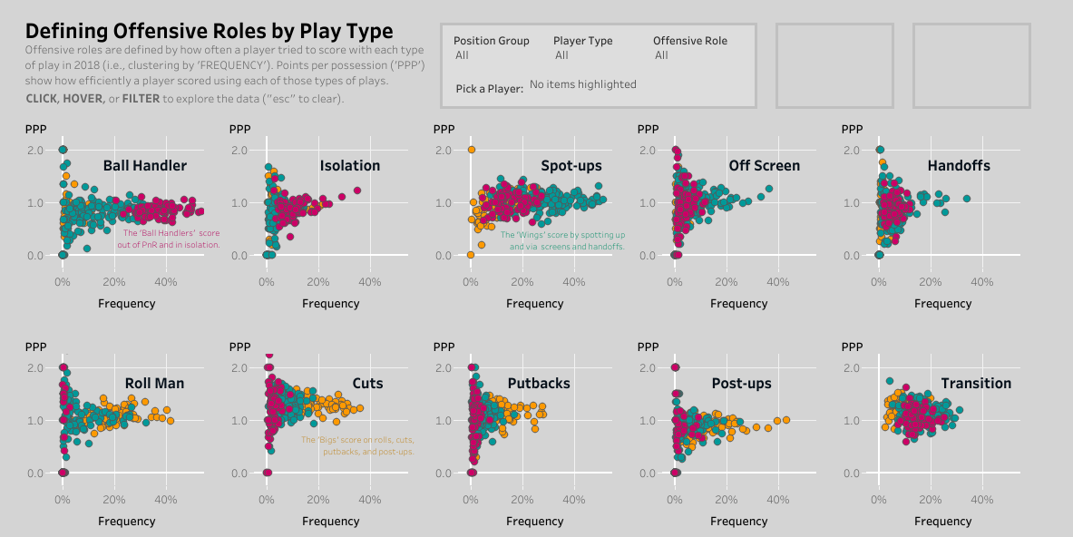 Here are the ten types of plays that I used to sort out the offensive roles. Click on the image below to visit a dashboard where you can highlight a particular player – how often did he try to score in isolation (frequency)? How many points per possession did he score when he tried (PPP)?
