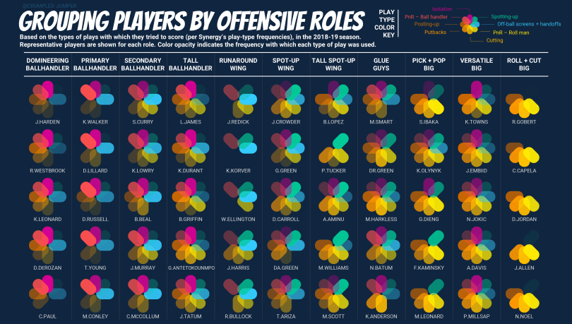 Most recently I used four seasons of NBA play-type data to make my own role-sorting formulas. In the end, I came up with 11 offensive roles — four types of ball handlers, three types of wings, and three types of bigs, with one jack-of-all-trades grouping, stuck somewhere in the middle. I used a multi-colored 8-petaled flower to visualize which types of scoring chances were used by players in each of the 11 offensive roles. Each petal represented one type of play, with its opacity showing how frequently that play was used. Each color was linked to the percentile rank of the corresponding play-type frequency; so that, if a player used a particular type of play less often than the rest of his peers, that petal was completely transparent. If a player used a particular type of play more often than the rest of his peers, then the petal was completely opaque. The result is that the ball handlers have the brightest pinks and purples, the wings have the brightest greens and blues, and the big men have the brightest yellows and oranges. In the image above, there’s a column with five players to serve as examples for each role.