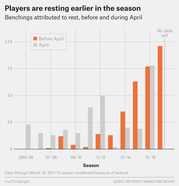 For FiveThirtyEight I wrote about trends in the number of games missed for “rest”. The graphics team helped me create this chart showing the increased frequency of DNP-Rest designations during the early part of the season from 2006 to 2017.