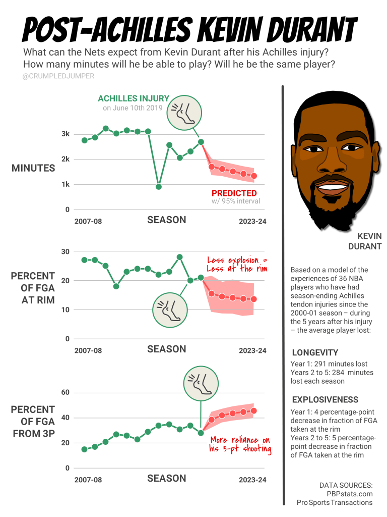 I ran mixed-effects models that relate the number of minutes a person played in a given season to his years of experience, the calendar year, and his injury status (ie, in the year of an Achilles injury, 1 year after his injury, or 2 to 5 years after his injury). The model defines a common shape of the aging curve for any NBA player but with a different amplitude defined for each individual and it allows us to see the impact — in terms of minutes lost — of an Achilles injury. Similarly, I created four skill-specific aging curves for at-rim frequency, at-rim accuracy, 3-point frequency, and 3-point accuracy. Using these models I predicted how many minutes Durant will play during each of his next five seasons as well as looking at how often and how well he might shoot at the rim and from the 3-point line.